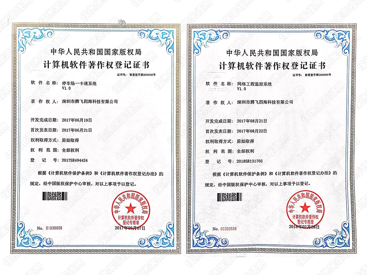 深圳市騰飛四海科技有限公司專注現(xiàn)代化企業(yè)信息建設(shè),爭做國內(nèi)互聯(lián)網(wǎng)與安防領(lǐng)域的領(lǐng)導者。作為一家擁有自主知識產(chǎn)權(quán)的國家高新技術(shù)企業(yè),在成立之初便堅持從用戶的實際需求出發(fā),以質(zhì)量求發(fā)展,以信譽求生存。歷經(jīng)15年的風雨路程,如今,我們已榮獲電子與智能化專業(yè)承包資質(zhì)、廣東省公安廳安防資質(zhì)、安全生產(chǎn)許可證資質(zhì)、計算機信息系統(tǒng)集成等多項資質(zhì)。截止目前公司已通過:ISO9001質(zhì)量管理體系認證,ISO14001環(huán)境管理體系和ISO45001職業(yè)健康安全管理體系;榮獲AAA資信認證、實用新型專利證書、計算機軟件著作權(quán)登記證書。公司現(xiàn)為深圳市安防協(xié)會理事單位,深圳市文明誠信企業(yè),廣東省“守合同重信用”企業(yè)、深圳市政府采購中心供應(yīng)商等多個榮譽證書。